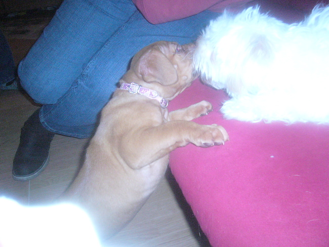 Honden foto's > raymond en ingrid > bo 6 weken en toetie aan het pesten