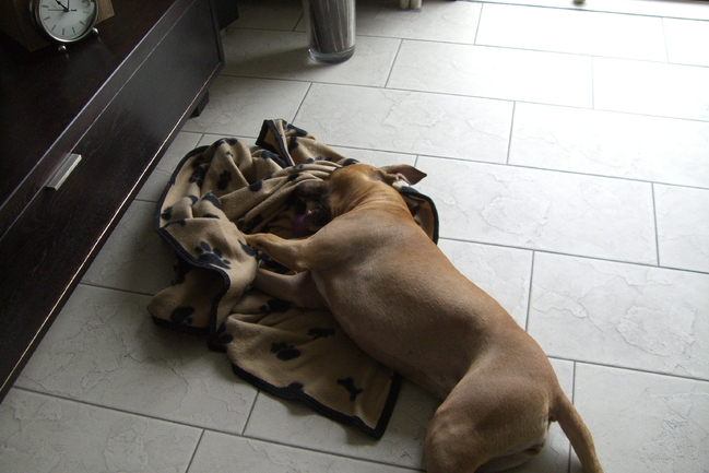 Honden foto's > Diana & Kiara > Vermaak me prima met mijn deken en botje