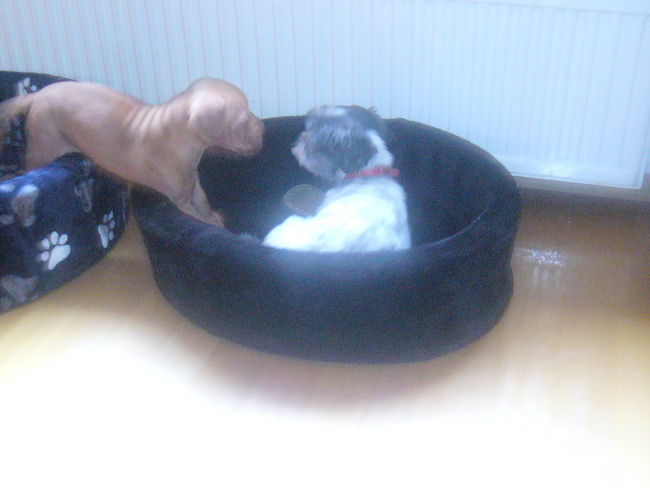 Honden foto's > raymond en ingrid > hhaha bo gaat pebbles even gezelschap houden in haar mand...