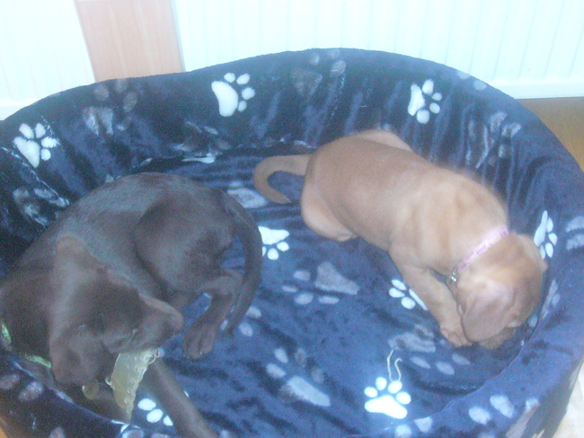 Honden foto's > raymond en ingrid > bo en binky in de mand lekker aan het kauwen...