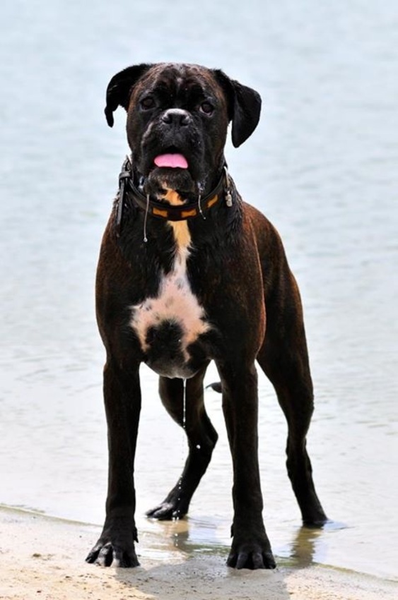 Honden foto's > Lenie Scholtens > Onze boxer Jim, pootjebaden! Water vindt ie geweldig zolang hij de grond maar voelt!