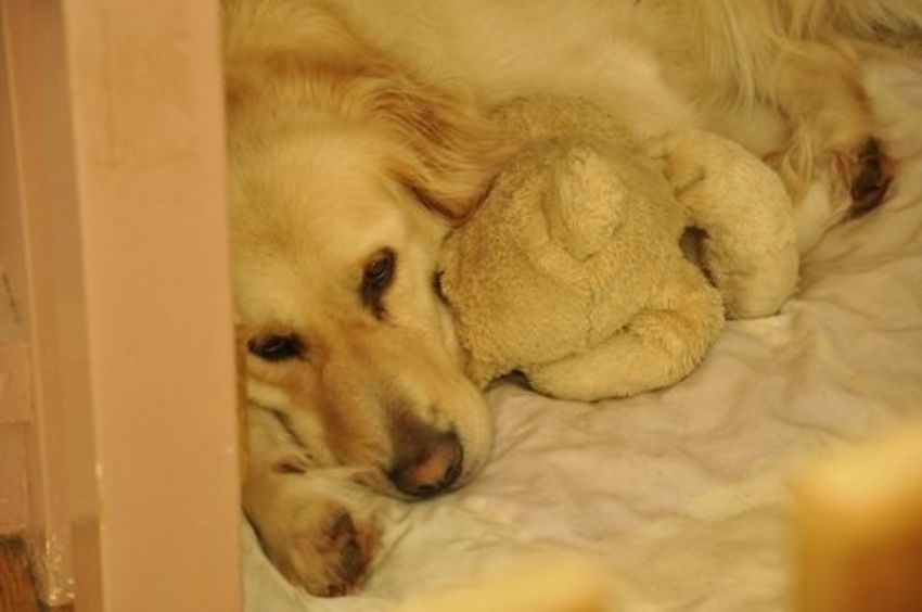Dit was wel een hele tijd geleden maar hier was ze zo moe ze pakte haar beer en ging in haar hok liggen van Romy&Kaya