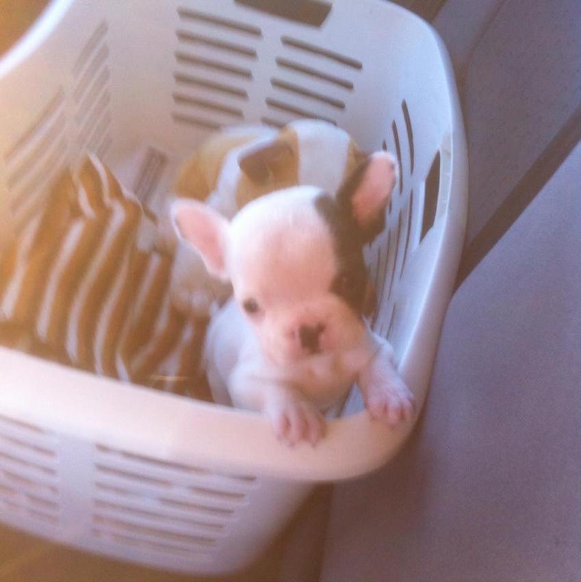> Onderweg naar huis met 7,5 week. Mevrouwtje was iets te mager en wou ook zeker niet in de mand blijven zitten, dus heeft ze de rest van de reis op schoot geslapen.