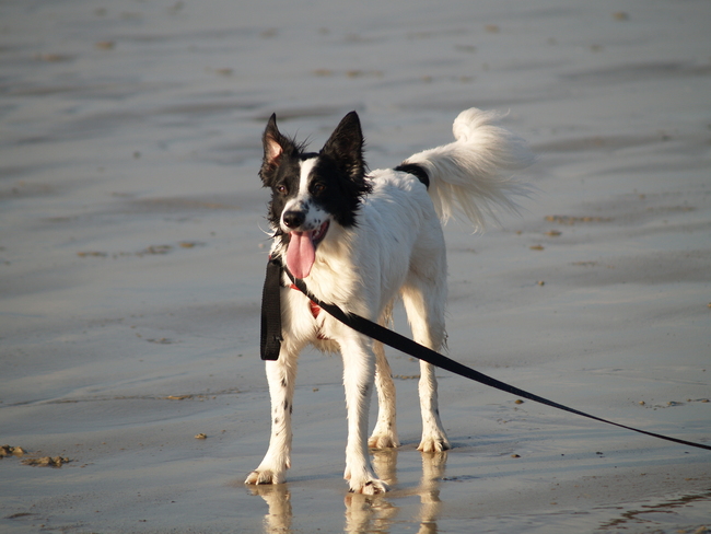 Honden foto's > Judith & Sam & Roos > roos op het strand, stoer he