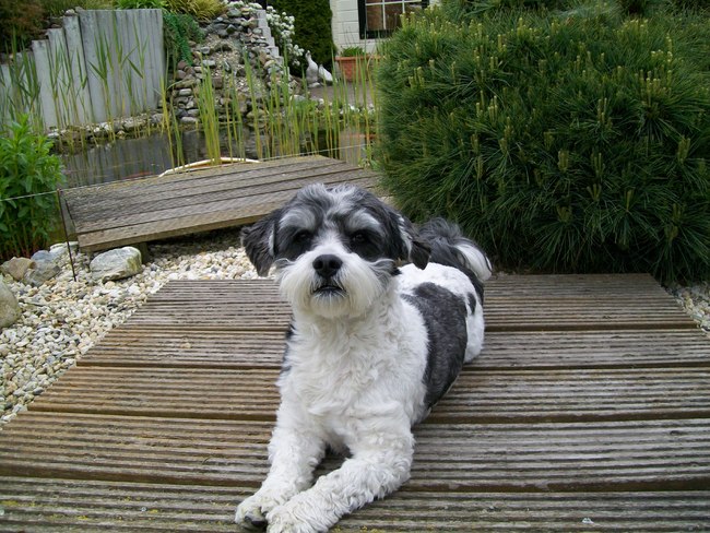Honden foto's > Laura & Sparky > sparky geposeerd voor de vijver