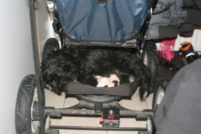 > moeder Dribbel,vindt het onder de kinderwagen erg knus! De eerste twee pups zijn daar geboren.....