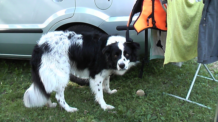> Ondanks zijn rugproblemen en artrose houdt Spotty heel erg van zwemmen, ookal heeft hij een zwemvest nodig.