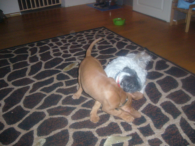 Honden foto's > raymond en ingrid > bo met pebbles aan het spelen (10 weken)