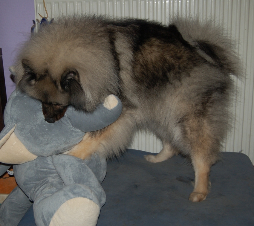 Honden foto's > grijze keeshonden Van het Earlskamp > Faith met haar nieuwe olifant