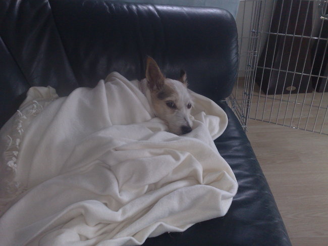Honden foto's > maaikiejj > mylo lekker ingepakt op de bank