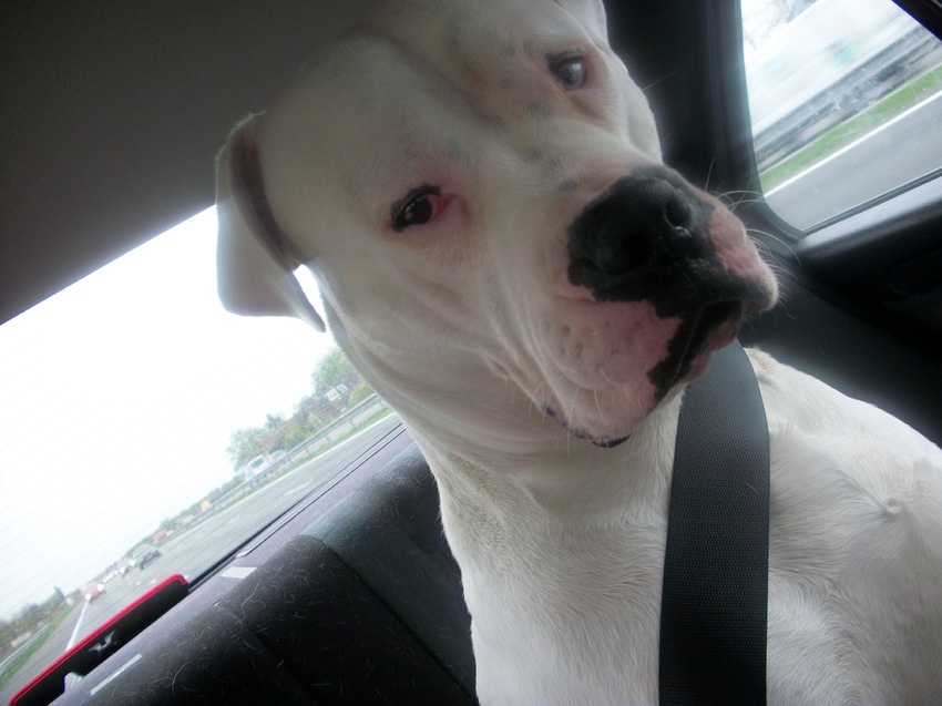 Honden foto's > R. Huizinga > Ook in de auto is het een raar gezicht, maar wel erg lief hahahaha