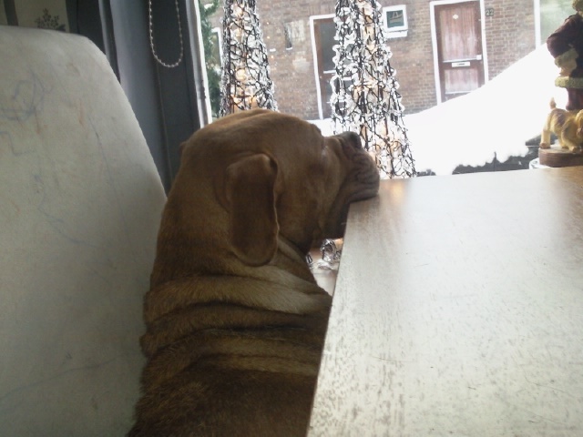 Honden foto's > TanjaWDD > Luna aan de eettafel lekker naar buiten kijken
