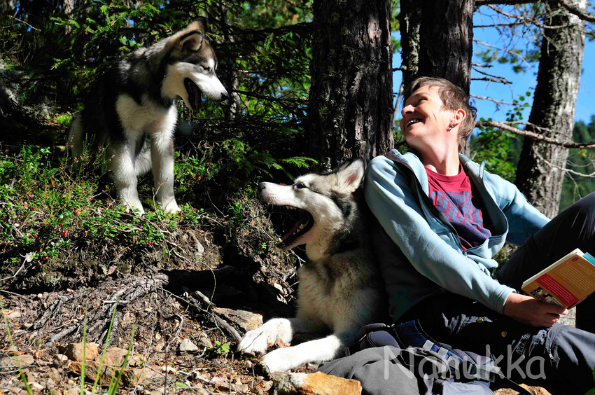 Honden foto's > Alaska's Finest! > Samen lachen met een boekje in het bos...