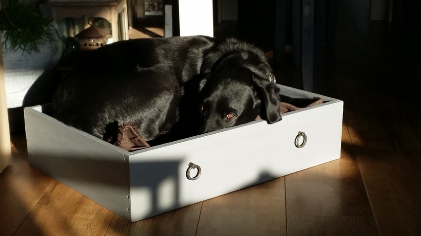 Honden foto's > Corrie en Blacky > Oude lade, gepimpt als hondenmand. Beetje klein.