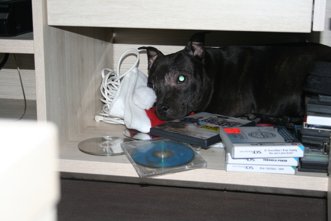 Honden foto's > Kim en Mika!! > Met oudjaar ben ik in de tv kast gaan liggen
