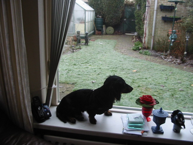 Honden foto's > rambo > rambo zit altijd op de vensterbank. Hij begrijpt nog niet dat vogels kunnen vliegen.