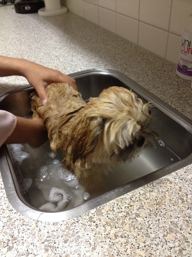 Honden foto's > elly > Lisa in bad, zo klein en nat,ze is er niet echt blij mee, maar na het fohnen is ze weer tevree.