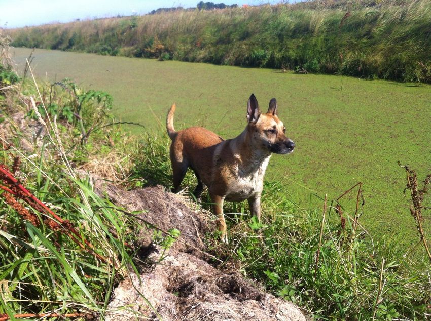 Honden foto's > Fiona > Tijdens het wandelen langs het caloriepad ff afkoelen.