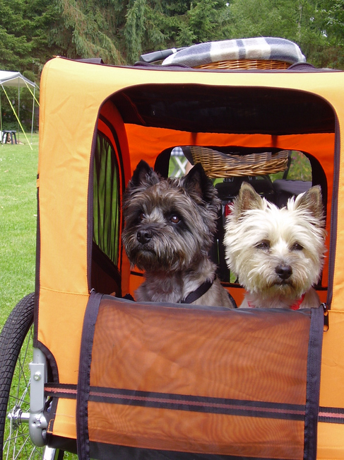 Honden foto's > Karin > Binky en Zenna in de fietskar op vakantie.