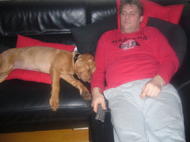 Honden foto's > raymond en ingrid > bo en baasje samen heerlijk op de bank