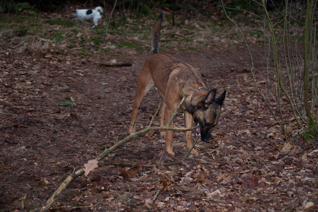 Honden foto's > De Mecheltjes clan > Even deze tak van het pad halen, mag toch niemand over vallen.