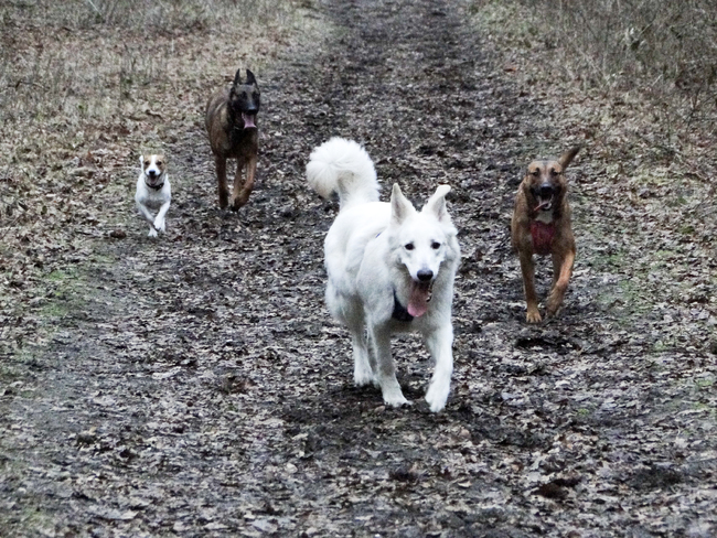 Ruim baan want Rowan komt er aan ... en naast en achter hem komen Bikkel, Myla en Bentley mee van Hetty & Skipper