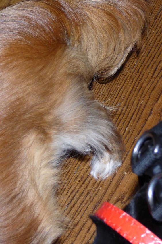 Honden foto's > Marga en de honden Balou R.I.P., Lotus en kat Nemo. > Het haar bij de pootjes begint te groeien.