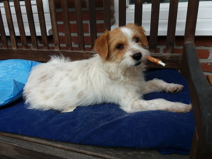 Honden foto's > Billie en Greet > Lekker op een stokje kauwen.