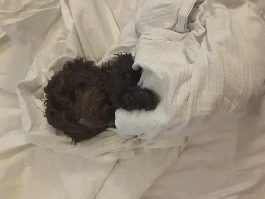 Honden foto's > Mirthe, yoshi & chewy > Chewy na het wassen, in gebakerd en fijn dat hij dat vind!