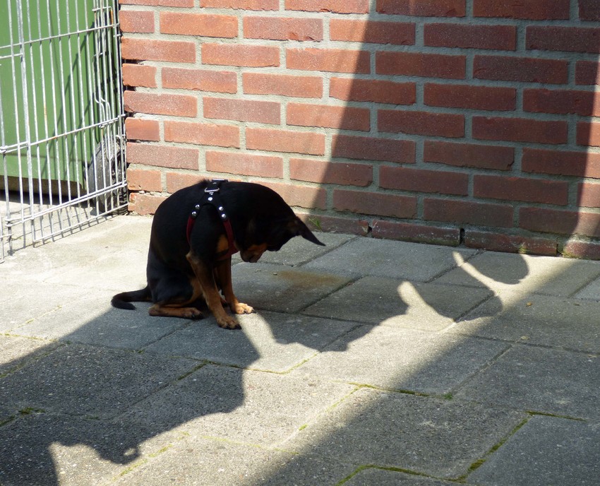 De was hangt te drogen en het waait een beetje, Balou vind de bewegende schaduw maar niets. van Marga en de honden Balou R.I.P., Lotus en kat Nemo.