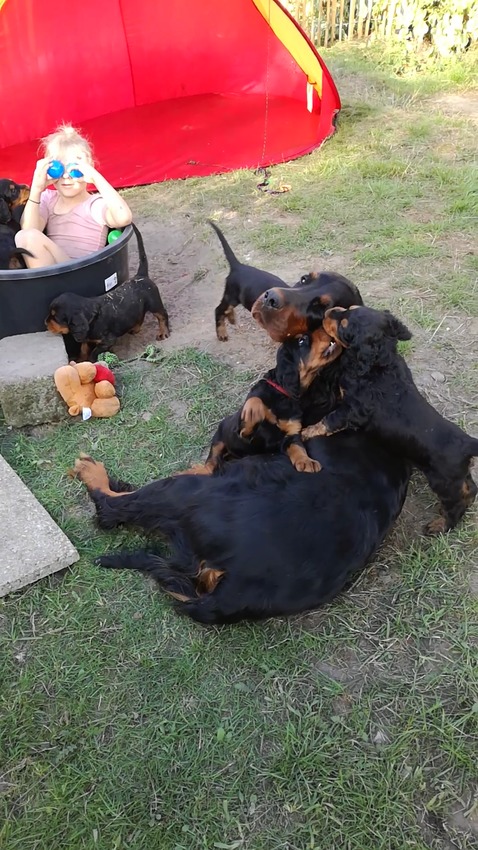 Cara en de R-puppies hebben bezoek van Hanna-Laure, 6 jaar jong en ballerina in spe. van Gordon Setters of the Purple Fallow