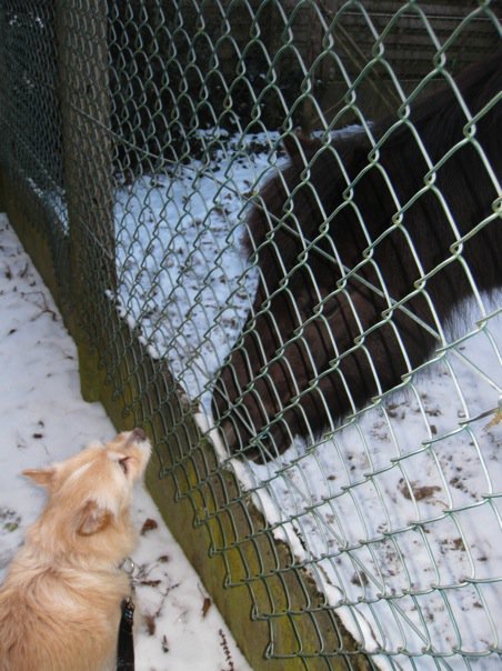 Honden foto's > Sarah, Aïcha + en Mica > Ontmoeting van Aïcha met een pony :-)