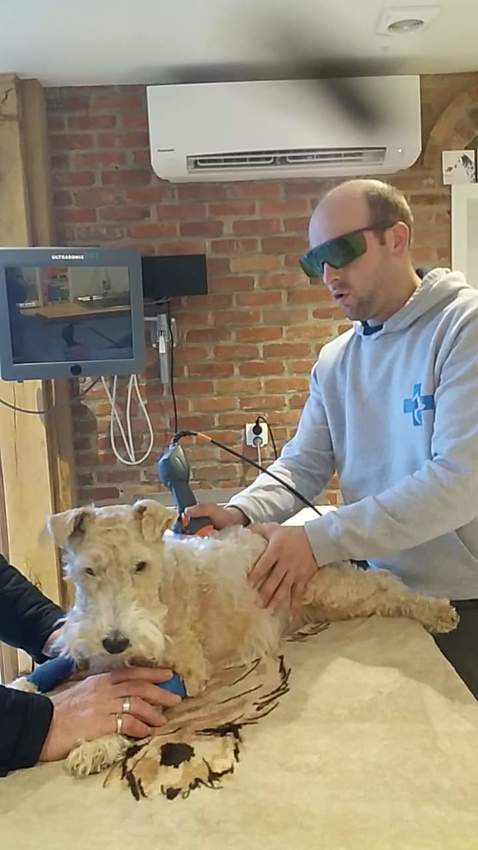 > Genia verlamd op de achterpootjes sinds einde jaar 2019 , foto tijdens lasersessie bij de dierenarts .