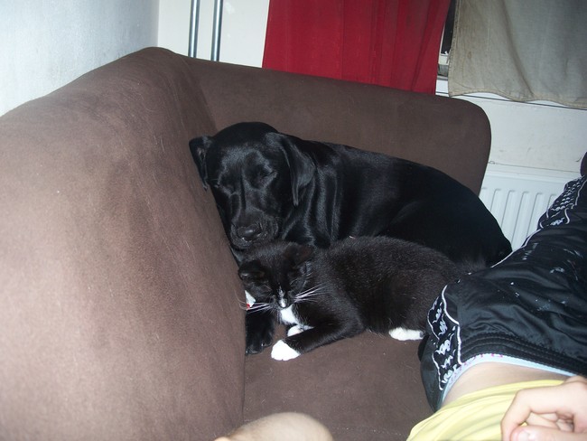 Honden foto's > Lyane > Dit is jersey onze jongste hond. Zij wordt in maart 3 jaar. Hier ligt ze samen met 1 van onze katten