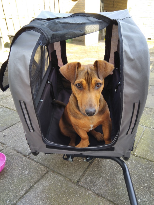 Honden foto's > Jessica&Twister > De eerste training met de fietskar.