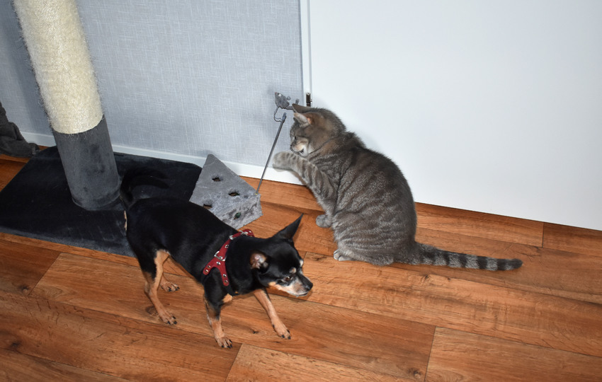 Honden foto's > Marga en de honden Balou R.I.P., Lotus en kat Nemo. > Balou heeft geen interesse in het speeltje van Nemo.