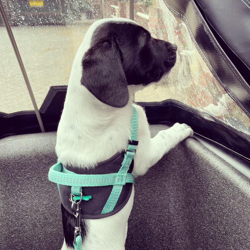 Cooper in de bakfiets van Marloes, baasje van Cooper