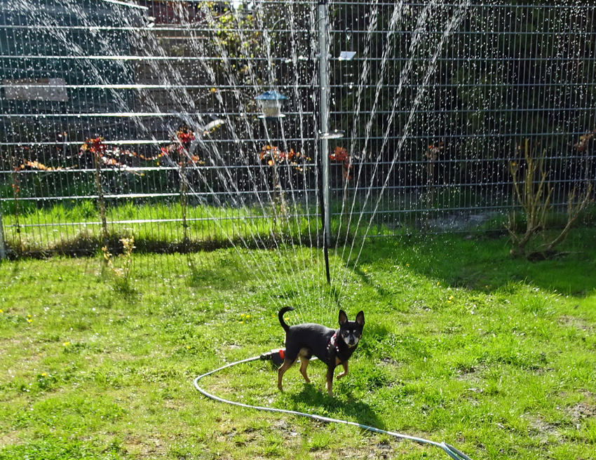 Balou die een hekel aan water heeft weet zo niet wat hem overkomt. van Marga en de honden Balou R.I.P., Lotus en kat Nemo.