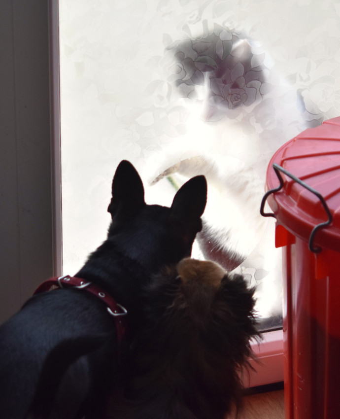 De honden maken ruzie wie voor het kijkgat naar de kat mag blaffen. van Marga en de honden Balou R.I.P., Lotus en kat Nemo.