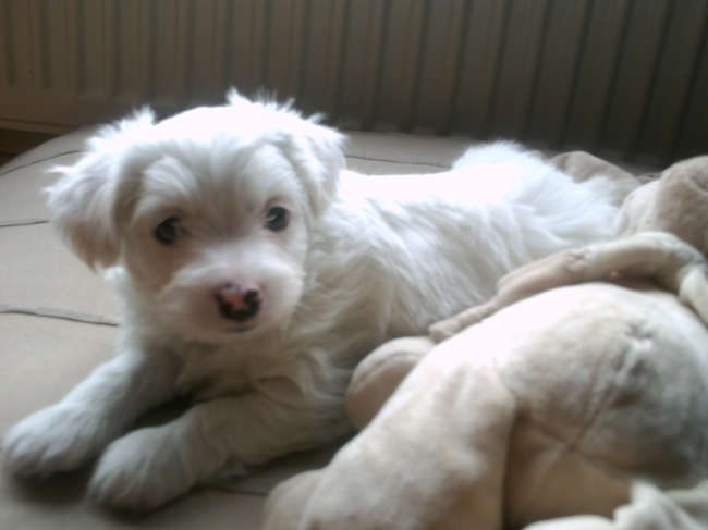 Honden foto's > marijke > mucky op zijn grote kussen en zijn konijn waar die helemaal gek mee is