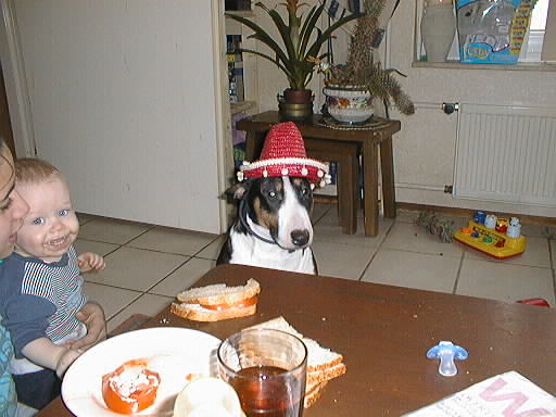 > Xena verkleed als mexicaantje.Zo heeft ze 1 uur gezeten en vond het toen welletjes.Hoedjes vind ze leuk om te dragen maar als ze er genoeg van heeft gaat ze ook onmiddelijk af