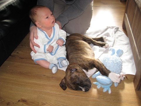 Honden foto's > laura > Bruno is hier 8 weken, de eerste kennismaking met mijn neefje Anthony die daar 7 weken was