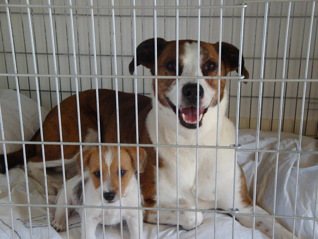 Honden foto's > Cel, Jacko, Louis en Poes > 1e keer samen in de grote bench