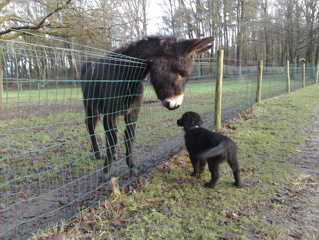 Honden foto's > sonja > benji maakt kennis met een ezel. benji is hier 9 weken oud
