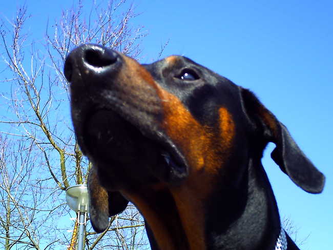 Honden foto's > Sandra en Amigo Dobermann > Blue sky.