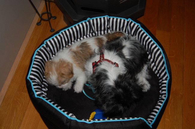 Honden foto's > inge > samen met vriendinnetje Sieva even uitrusten in de mand