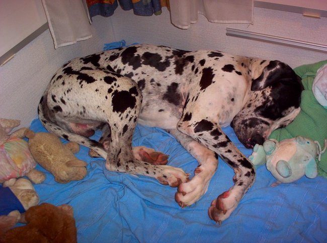 Honden foto's > Rob, Sas, Goof en Kira > Dudley had zijn eigen bed in de caravan.