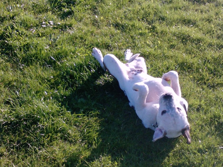 Honden foto's > Renée & Gino! > Lekker rollen in t gras, hier precies een half jaar.