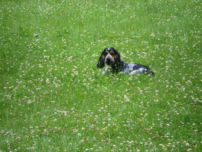 Honden foto's > Joey-Dancer > Lekker liggen in het gras. Met een sigaar kijk maar goed.
