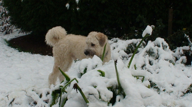 Mijn blonde bouvier 'Flodder' die aan het spelen is in de sneeuw. van sonja Decroock